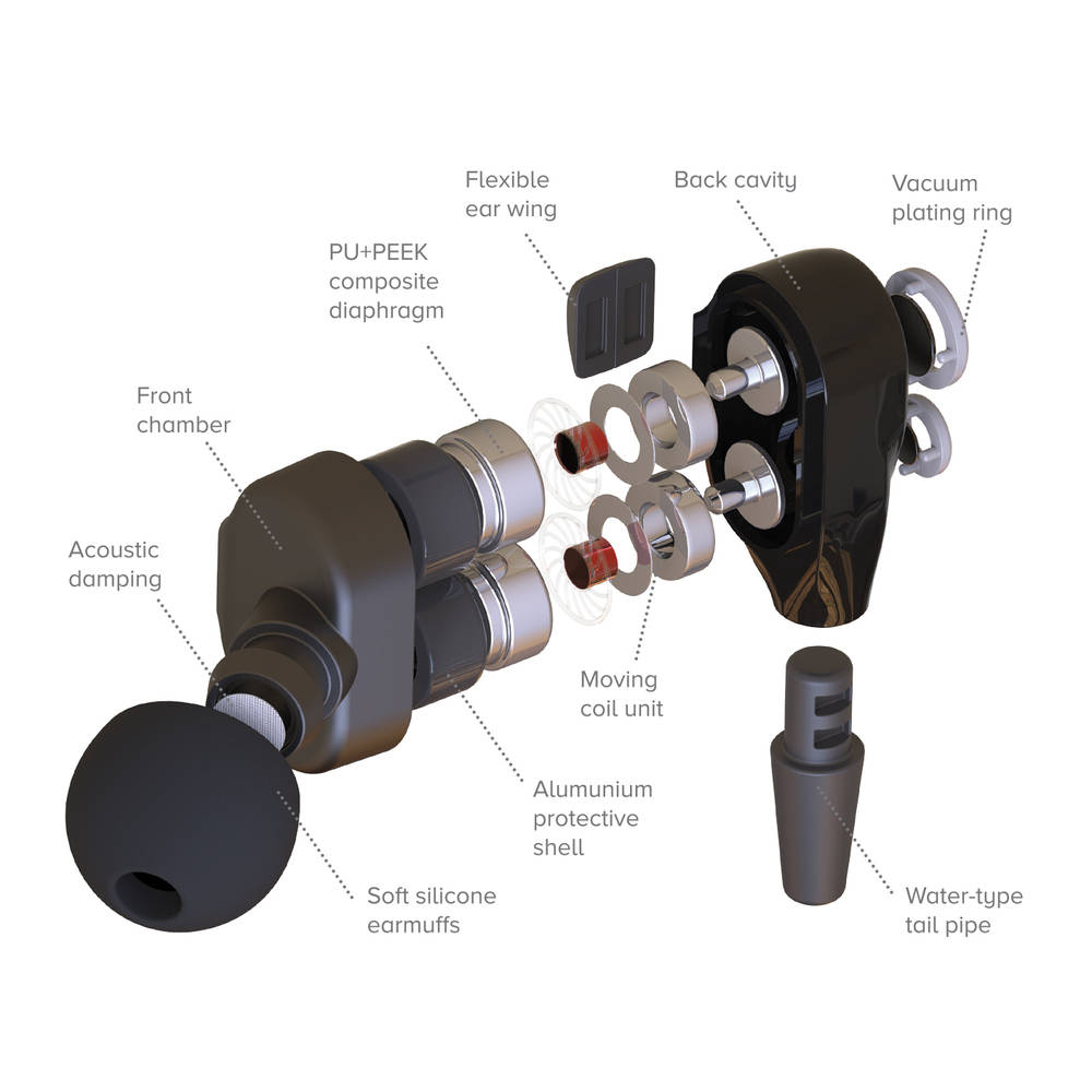 A round, high-strength conductor, braided by Kevlar fibres, leads from both in-ear monitors.