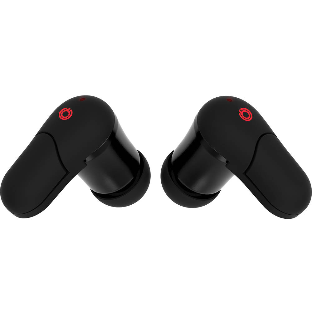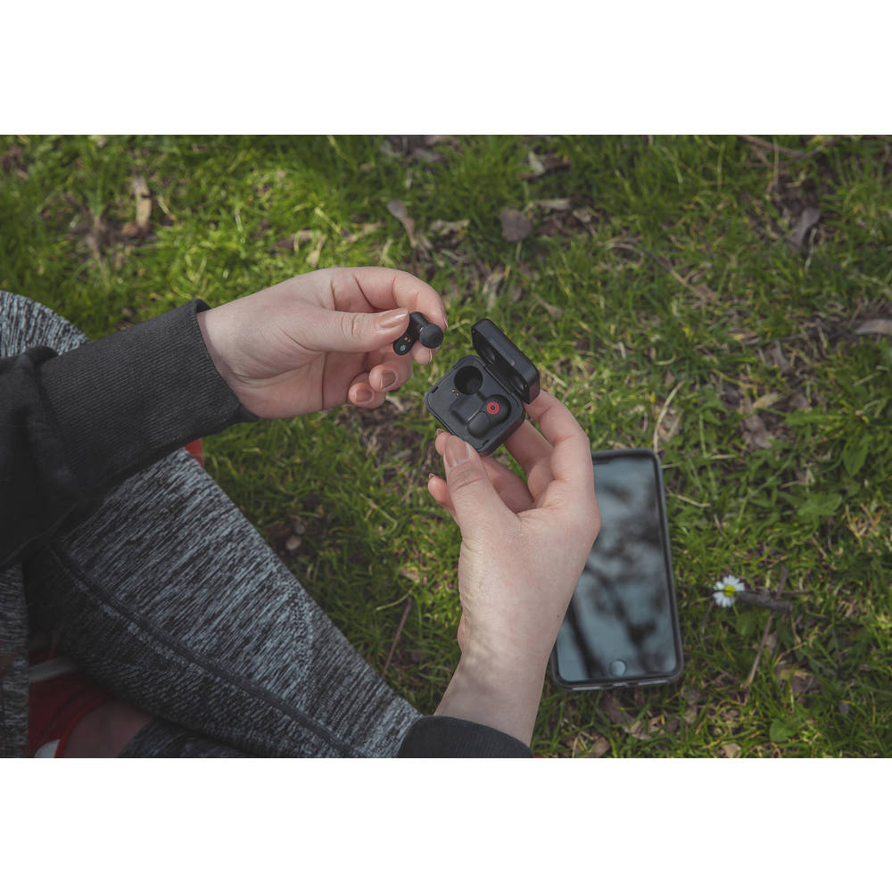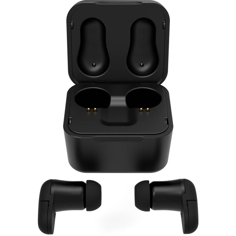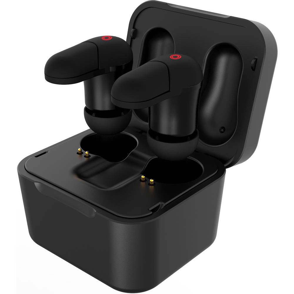 Each earphone contains a battery for 3 hours of operation; the supplied charging base will charge them for another three 3-hour cycles.